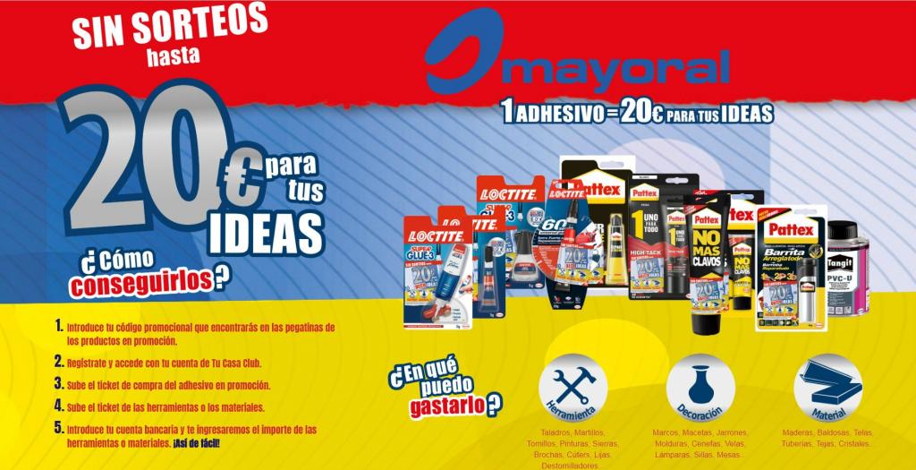 Por la compra de un Loctite Orig (3 gr), Pincel (5 gr), 60 sec (20 gr) o Pen (3 gr), Loctite® te regala hasta 20€ (IVA incluído) para gastar en Mayoral en material relacionado con dichos productos (destornilladores, martillos, cúters, tornillería, serruchos, flexómetros, etc). ¡¡SIN SORTEOS!!