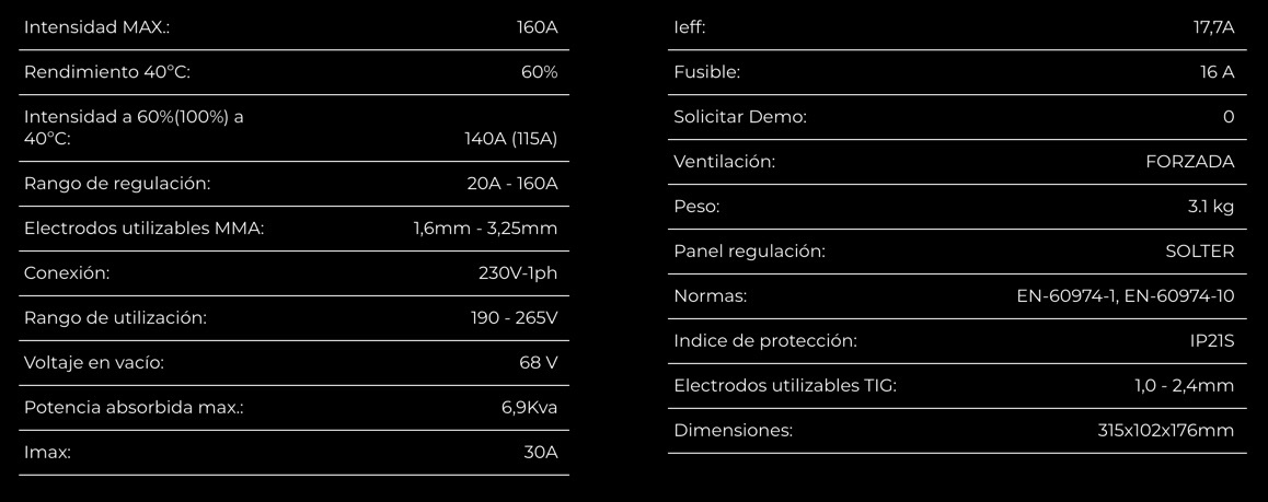 - Inverter de 160 Amp al 45%.
